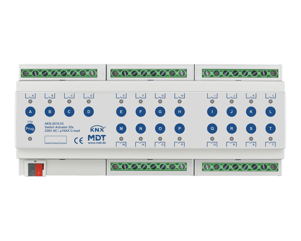 MDT-AKS-2016: KNX Switch Actuator 20-channel, 12 SU MDRC, 16 A, 230 V AC, C-load, standard, 140 μF